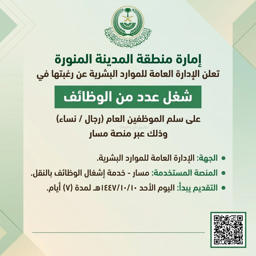 أعلنت إمارة منطقة المدينة المنورة ممثلة في الإدارة العامة للموارد البشرية عن توفر عدد من الوظائف على سلم الموظفين العام، وذلك من خلال خدمة إشغال الوظائف بالنقل عبر منصة منصة مسار، وفق التفاصيل التالية: